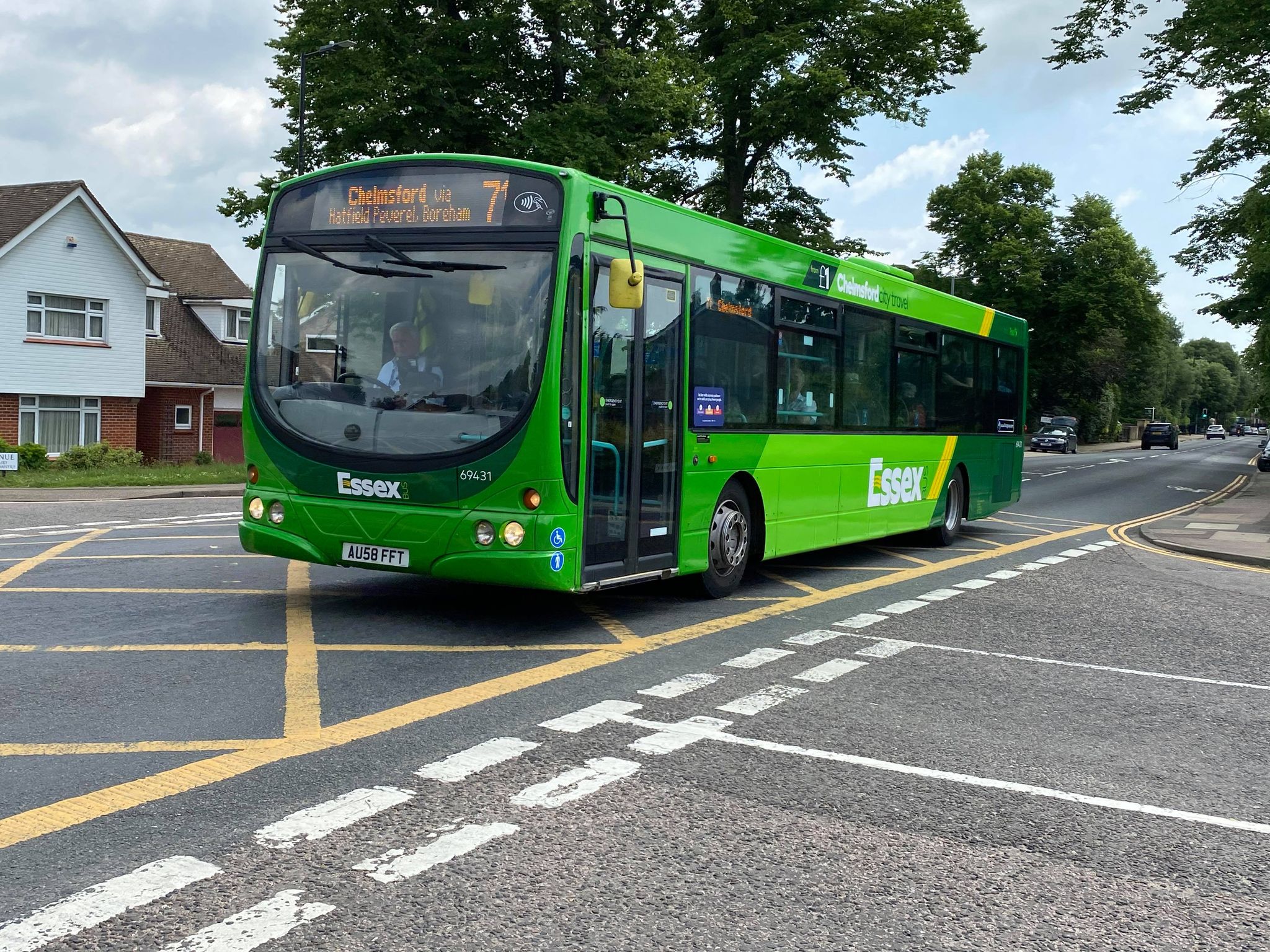 Volvo B7RLE/Wrights 69431/33 (AU58 FFT/V) are now in green Essex Bus livery. 69515 (BJ11 ECN) was loaned by HH to BN for 27/6/21 only. Odd sightings: 1/6/21: 32087 on 102; 37006 on 66; 37007 on 67; 37054 on 103; R62 37136 on 61; 42968 on 71A; 67189 on 71B; 67195 on 42. Airlink 67161 on 8A. 2/6/21: 32673 on 174; 37016 on 67; 37042 on 64A; R62 37133 on 61; R62 37138 on 68; 42931 on 71A; 47657 on 100; 66816 on 62; 67193 on 36; 67194 on 71; 67197 on 31X. 3/6/21: 32477 on 103; 37036 on 67; R62 37135 on 1A; R62 37136 on 75; 42895 on 71A; 66798 on 75/A; 67193 on 31C; 67194 on 42. 4/6/21: 30785 on 103; 37020 on 67; 37035/053 on 64; R62 37138 on 61; 42922/968 on 71A; 47652/53 on 100; 67190 on 31X; 67194 on 31C; 67735/36 on 75; 67805 on 75. 5/6/21: 30567 on 61; 37005 on 67; 37015 on 64; 37035 on 67. 6/6/21: 32087 on 64; 32628 on 67B; 37005/007; 27020 on 64; 37036 on 64A. on 1027/6/21: 32485 on 103; 37015 on 104; 37017 on 17; 37053 on 102; R62 37133 on 65 + 1A; R62 37135 on 61; R62 37138 on 88; Airlink 67163 on 25; 67196 on 31C; 67197 on 31X. 8/6/21: 32485 on 102; 32628 on 104; 37010 on 66B; 37020 on 103; 37035 on 67; R62 37136/38 on 75; Airlink 67161 on 8A; Airlink 67163 on 8; 67193 on 31C; 67197 on 71 + 351. 9/6/21: 31785 on 103; 32478 on 64A; 32669 on 67; 37004 on 102; 37020 on 103; R62 37133 on 88; R62 37138 on 88A; 42935 on 71A; 67189 on 31X; 67196 on 71A; 67197 on 31C. 10/6/21: 32485 on 64A; 32547 on 67; 32669 on 102; 37017 on 103; 37054 on 17; 42895 on 71A; 67193 on 31C; 67196 on 31X. 11/6/21: 37015 on 103; R62 37133 on 70; R62 37135 on 65; R62 37136 on 64; R62 37138 on 75; 42939 on 71A; 42652 on 100; 67190 on 31C; 67194 on 31X. 12/6/21: 32628 on 102; 42935 on 71. 17/6/21: 32068 on 67; 32087 on 67; 32628 on 103; 37004 on 64A; 37015 on 174; 37017 on 64A; 37020 on 67; 37034 on 103 + 67C; 37054 on 64; R62 37138 on 104; 67190 on 31X; 67193 on 31C; 67190 on 31C. 18/6/21: 32477 on 67C; 32673 on 66; 37034 on 64; 37035 on 67; 37062 on 64; R62 37135 on 65; R62 37136 on 103; 42895 on 71; 47654/56 on 100; 67193 on 31C; 67195 on 351; 67197 on 31C. 19/6/21: 31785 on 175; 42929 on 71. 20/6/21: 37004 on 64B; 37005 on 64; 37006/007 on 64A; 37036/042 on 66; R62 37135 on 64; R62 37136 on 65. 21/6/21: 32087 on 67; 32547 on 67C + 17; 32669 on 17 am; 37016 on 67; 37140 on 175/174; 42937 on 71B; 42941 on 71A; 67189 on 31X; 67191 on 31B; 67193/94 on 31C; 67197 on 42B. 22/6/21: 37016/035 on 64A; 37037 on 67; 42944 on 71A; 47656/57 on 100; 67194 on 70; 67197 on 31C. 23/6/21:32551 on 71X; 32673 on 67; 37010 on 104; R62 37133/36 on 75; R62 37138 on 70; 42940 on 71A; 67189 on 42; 67190 on 31C; 67191 on 31X; 69433 on 72. 24/6/21: 32628 on 103; 37062 on 64; R62 37133 on 64A; R62 37136 on 88; R62 37139 on 75; 42922 on 71B; 67195 on 31C; 671296 on 31B. 25/6/21: 37015 on 67; 37035 on 104/103; 37062 on 64A; R62 37133 on 65; R62 37135 on 88; R62 37136 on 64A; 42941 on 71A; 47654 on 100; 67192 on 31C; 67193 on 31X; 672195 on 42; 67197 on 71B. 26/6/21: 37034 on 64A; R62 37136 on 70/74B; 42936 on 71.