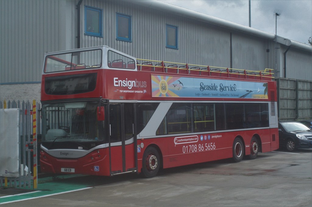 Above: An open top ADL/Enviro 500 368 (68 EB) , is now here. It was new as an ADL Hong Kong development vehicle. It was acquired in closed top form in plain white, and converted/repainted. It was berthed at the Arriva Southend depot on 30/7/21. (John Podgorski).