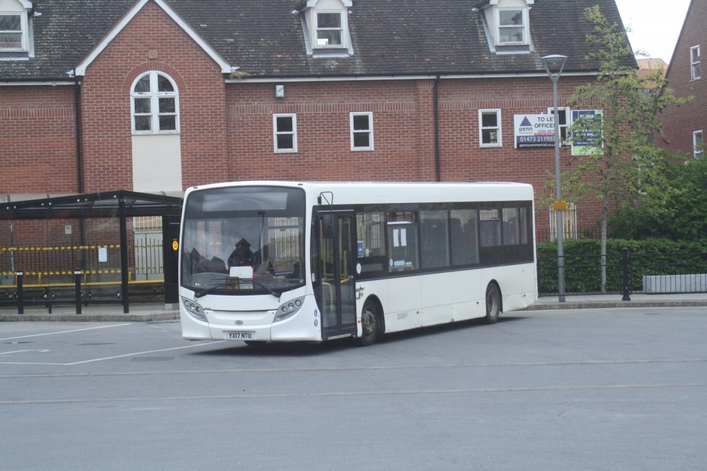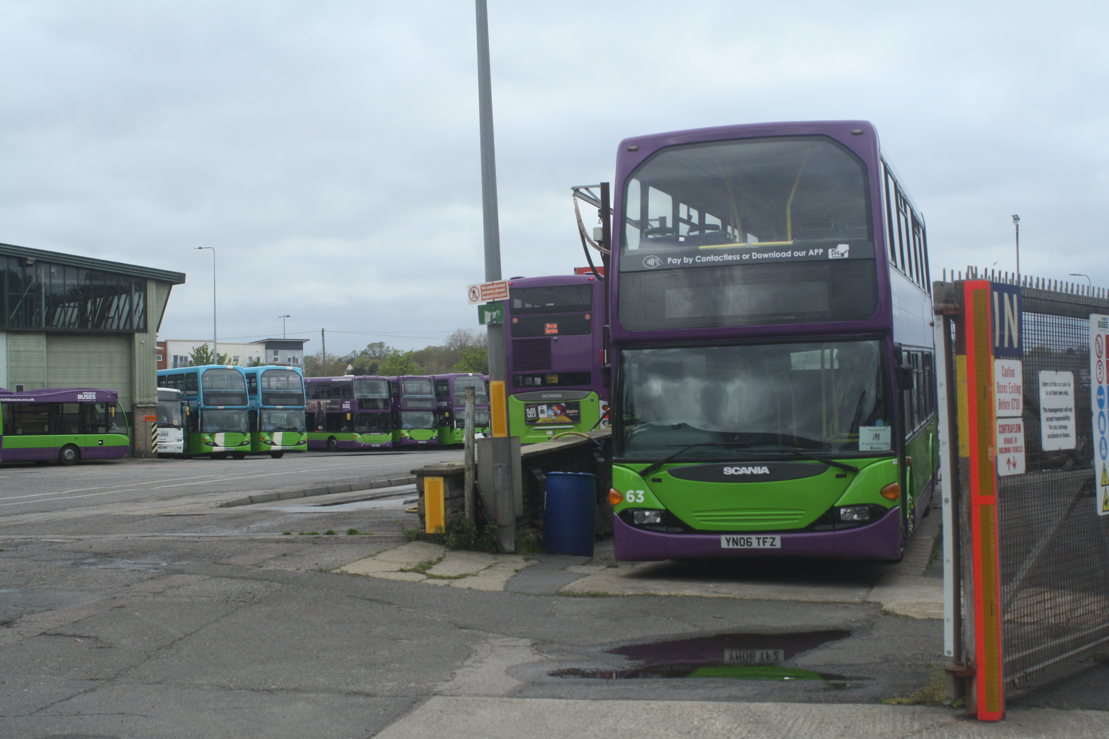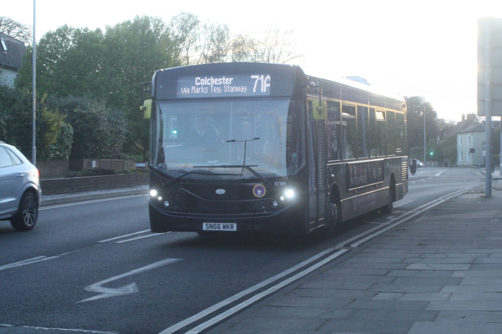 Some Volvo B7RLE/Wrights have been outshopped in a slightly revised livery, featuring a greater area of white. 69429/32/34 have been seen. 69429 lost its Co Op super rear advert as a result. StreetLite 47529 (SN64 CNJ) has a super rear advert Essex and Suffolk Water. The travel offices at Chelmsford and Colchester, closed since the start of the lockdown in March, are to remain closed, with all furloughed staff being made redundant. The old Haven Road depot in Colchester, has been vacated by its last occupier, Revis Motors. Scania L94UB/Wright Solars YS03 ZKB/K have been resold by Ensign to Laurenson, Preston (dealer). ADL/Enviro 300 67756 (SN62 ASU) is delicensed due to accident damage. Odd sightings: 1/10/20: B7TL/Geminis 32628/29 on 104; Airlink Scania N250UD/E400 36840 on 70; B7TL/Gemini 37036 on 175 am. Dart SLF/Pointer 42932 (SN05 EAP) on 71; X10 ADL/E200 MMC 67160 on 5B; Airlink ADL/E200 MMC 67163 on 100; X10 ADL/E200 MMC 67164 on 100. 2/10/20: 37036 on 175 am; Dart SLF/Pointer 42927 (SN05 EAF) on 71. 3/10/20: R62 B9TL 37134 on 61. 4/10/20: Airlink ADL/E200 MMC 67163 on 100. 5/10/20: B7TL/ALX400 32477 on 175 am; Airlink Scania N250UD/E400 City 36843 (YN69 XYD) on 70; B7TL/Gemini 37016 on 64A; 37020 on 67 + 68; 37042 on 64A; R62 37134 on 61; R62 37136 on 65 + 1A; R62 37138 on 61; X10 67161 on 5B; X10 67164 on 8A.; short ADL/E200 44900 on 70. 6/10/20: 36843 on 70; 37034 on 175 am + 104; R62 37136/38 on 61; Dart SLF/Pointer 42935 (SN05 DZO) on 71A; X10 67161 on 8A; X10 67162/64 on 8; Thamesway B7RLE/Wright 69520 (BJ11 ECW) on 26. 7/10/20: Airlink 36838 on 70; Airlink 36843 on 70; R62 37134 on 61; R62 37139 on 70; X10 67161 on 5B; X10 67162 on 8; X10 67164 on 5B. 8/10/20; Airlink 36838 on 42; Airlink 36840 on 70; R62 37136 on 61. 9/10/20: 36839 on 70/71X; 36842 on 70; 37004 on 104; 37042 on 103; X10 67161 on 5B; X10 67164 on 100. 10/10/20: R62 37139 on 2A. 11/10/20: B7TL/Gemini 37054 on 64; short ADL/E200 MMC 44659 on 71C. 12/10/20: 32673 on 103; 63836 on 70; 36840 on 42; 36843 on 70/71X; 37036 on 104; R62 37136 on 61; Dart SLF/Pointer 42922 (EU05 AUO) on 70; Dart SLF/Pointer 42939 (WX05 SVE) on 71; long ADL/E200 44596 (EU60 LFS) on 13; X10 67160 on 5; Airlink 67161on 25; X10 67164 on 5B. 13/10/20: 32547 on 103; 36838 on 70; 37017 on 102; R62 37133 on 61; R62 37138 on 65; 37140 on 104; X10 67160 on 5; Airlink 67161 on 25; X10 67164 on 8; P&R 67196 (SN66 WKT) on Chelmsford Staff Shuttle. 14/10/20: P&R ADL/E200 MMC SN66 WKO on Chelmsford Staff Shuttle. 15/10/20: 36840 on 71X/70; 37020 on 64; 42927 on 71; 67171 on Chelmsford P&R. 16/10/20: 36842 on 70; 37006 on 102; X10 67160 on 100; Airlink 67161 on 8; X10 67164 on 25. 17/10/20: R62 37136/38 on 61; 67736 on 62B. 18/10/20: Airlink 67163 on 100; X10 67164 on 100. 19/10/20: Airlink 36838 on 70. 20/10/20: First Eastern Counties Ipswich Reds B7TL/ALX400 32475 (AU53 HJJ) at Colchester depot; 36838 on 70; YN69 XXU on 525; 37053 on 66; 37004 on 102; 37015 on 104; R62 37133 on 88; R62 37136 on 64; R62 37139 on 65 + 1A; Airlink 67161 on 25; X10 67164 on 100. 21/10/20: 32547 on 64; 32628 on 66; 37054 on 104; 37062 on 103; R62 37133 on 75; R62 37134 on 88; R62 37138 on 61; Airlink 67161 on 5. 22/10/20: R62 37138 on 75. 22/10/20: 32476 on 66; R62 367134 on 64A; X10 67160 on 25. 23/10/20: 32478 on 102; ; 37017 on 66; 37036 on 104; 37054 on 103; R62 37134 on 64A; R62 37136 on 65; R62 37138 on 61; Airlink 67161 on 100; Airlink 67163 on 5. 24/10/20: R62 37133 on 61; R62 37134 on 64A; R62 37135 on 75; R62 37136 on 61; R62 37139 on 61. 25/10/20: R62 37133 on 61; R62 37134 on 65; R62 37135 on 66; R62 37136 on 61; R62 37138 on 65. 26/10/20: 36842 on 42; 37005 on 103; R62 37133 on 75 + 1A; R62 37134 on 88; R62 37138 on 65 + 1A; 44006 on 10; Airlink 67161; X10 67162 on 5. 27/10/20: 30560 on CR Staff Shuttle; 32478 on 104; 37053 on 67; R62 37133 on 61; R62 37135 on 75; R62 37136 on 88A; X10 67160 on 25; P&R 67191 (SN66 WKM) on 71B. 28/10/20: 37035 on 103; 37062 on 102; R62 37134 on 2A; R62 37136 on 70. 29/10/20: 37016 on 102; R62 37134 on 99; R62 37135 on 6530/10/20: 37034 on 104 + 102; R62 37135 on 65; R62 37136 on 61; 67166 on X10; P&R 67191/96 (SN66 WKM/T) on 36; 67196 on 71. 31/10/20: 32476 on 104; 32478 on 64A; 32628 on 102; 37034 on 103; R62 37139 on 2A; Dart SLF/Pointer 42968 (WX06 ONC) on 71A; Airlink 67163 on 16; X10 67164 on 25.